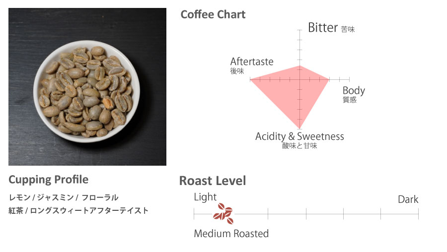 粒が大きく、細長い外観をしており、カップは非常に秀逸なフローラルなアロマ と柑橘類を思わすフレーバー、驚くほどすっきりした甘味を伴った酸味が特徴的です。